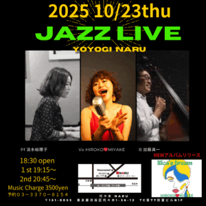 HOME Post Share Hatena Pocket RSS feedly Pin it Post Share Hatena Pocket RSS feedly Pin it 投稿者: ミヤケ コメント: 0 コメント ( 0 ) トラックバックは利用できません。 この記事へのコメントはありません。 返信をキャンセルする。 名前 ( 必須 ) E-MAIL ( 必須 ) ※ 公開されません URL 上に表示された文字を入力してください。Δ 関連記事一覧 私のヴォーカルレッスンについて、 2023.02.09チャクラ共振発声法とJazzvocalレッスン 2019年10月以降ライヴ情報 2019.10.08JAZZ, LIVE出演情報 2019年9月10日火曜日御茶ノ水NARU出演 2019.08.28LIVE出演情報 2018年11月ライヴ情報 2018.11.02LIVE出演情報